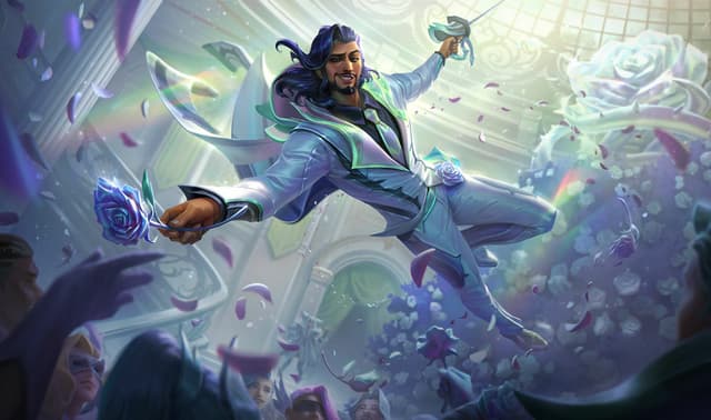아크샨이 갈고리총을 발사해 지형에 고정시킨 후, 갈고리에 매달린 채 가장 가까운 적을 연속으로 공격하며 이동합니다. 기동 중 챔피언이나 지형에 충돌하면 땅으로 떨어지며, 도중에 스스로 뛰어내릴 수도 있습니다.